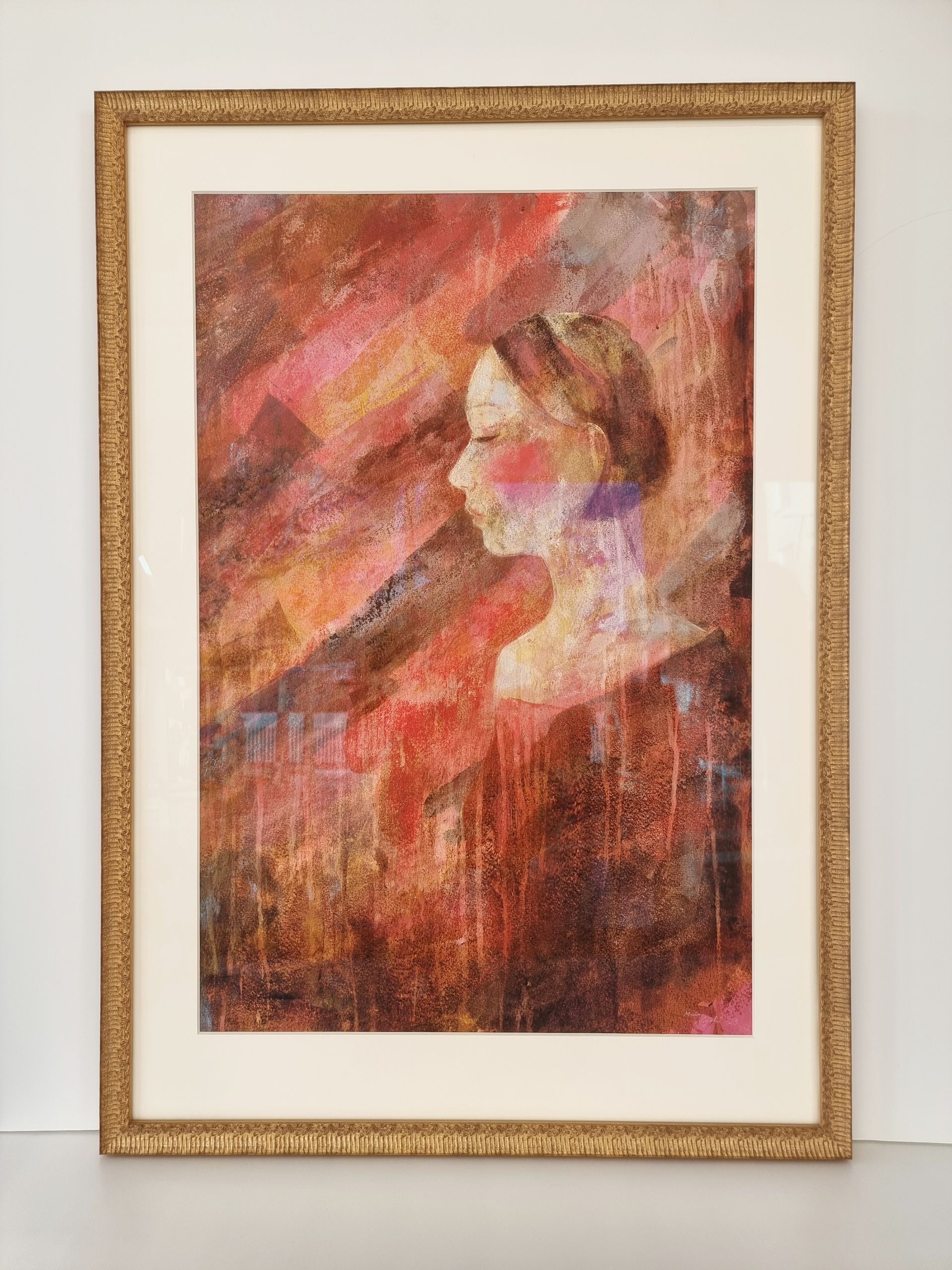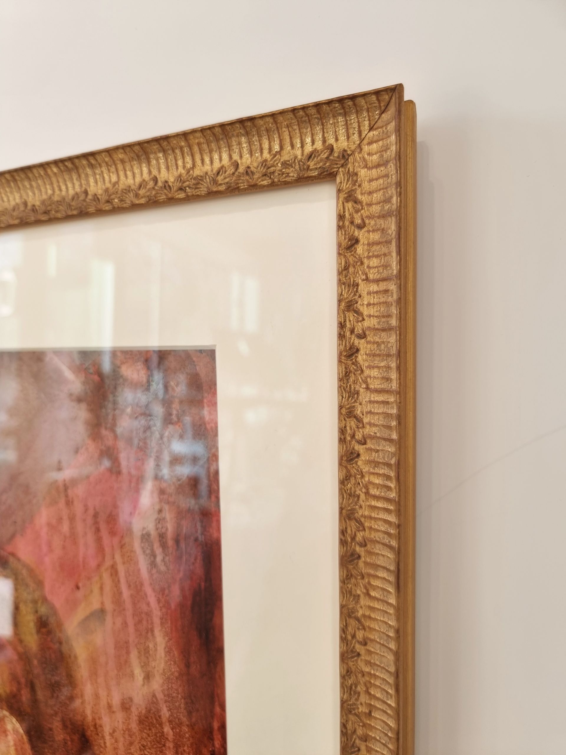 Elävä ja vivahteikas akryylimaalaus paperille. Olen kehystänyt teoksen kauniisiin kultakehyksiin, joissa on hillittyä kasviornamenttikuviota. Teoksen suojana on taidelasi, jossa on heijastuksenesto ja vähintään 70 %:n UV-suoja. Koko kehyksineen on 87x61 cm.