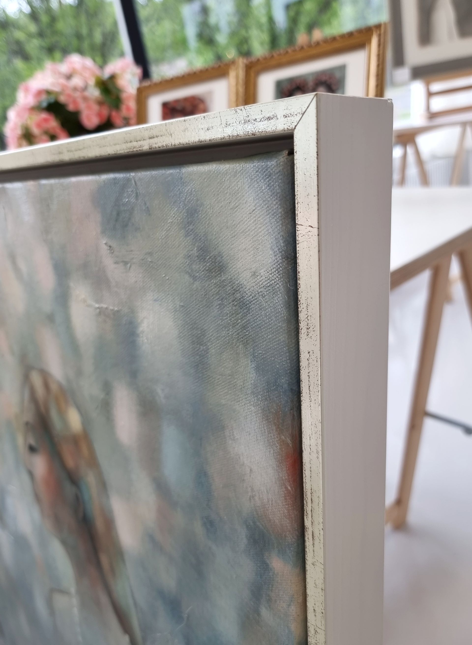 Teos kuvaa kahden ihmisen katkeamatonta yhteyttä toisiinsa. Olen kehystänyt teoksen suomalaiseen tilakehykseen, jonka etureuna on himmeän hohtava ja sivureunat luonnonvalkoiset. Koko kehyksineen on 95x97 cm.