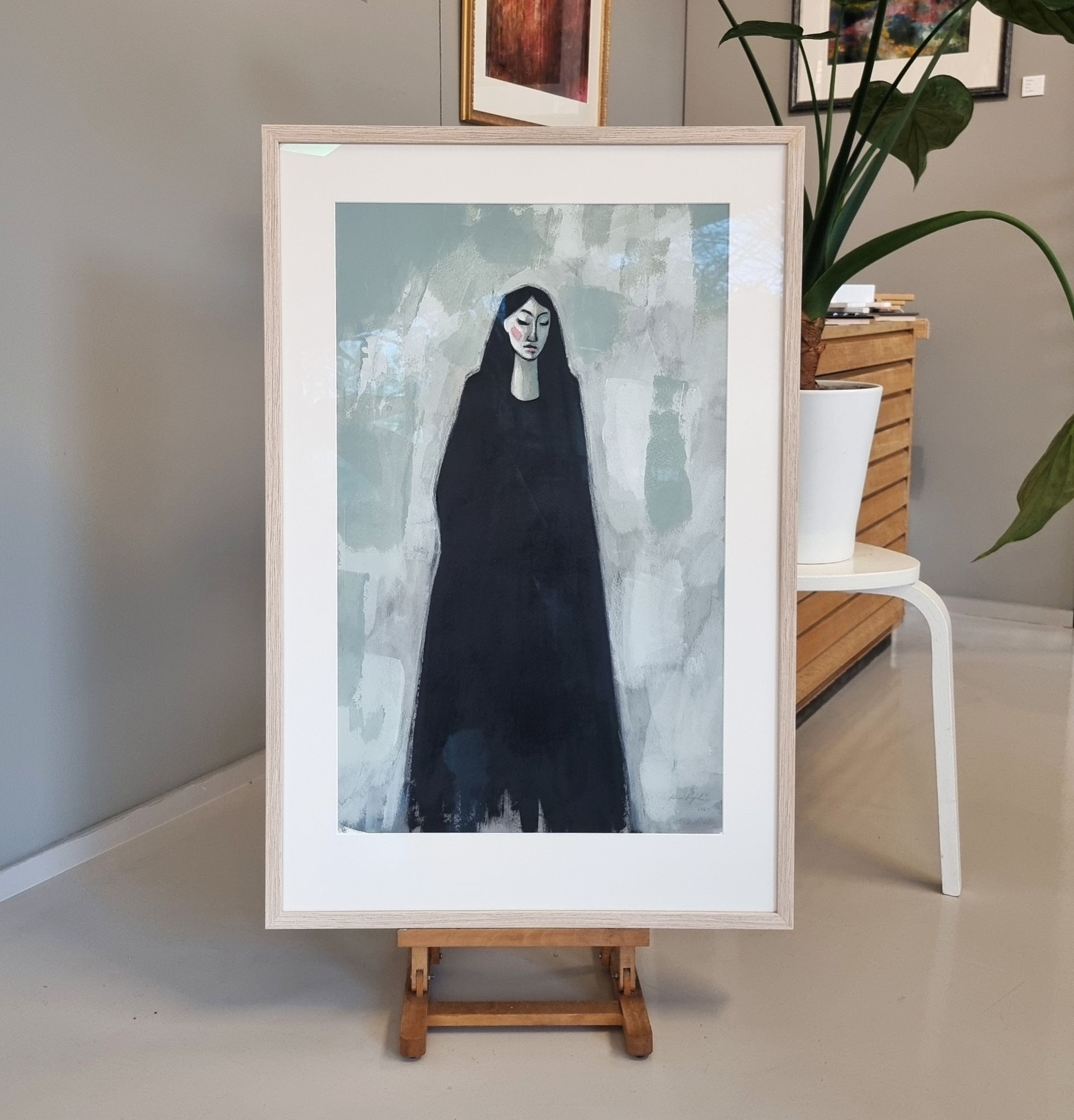 Olen maalannut teoksen akryyliväreillä laadukkaalle akvarellipaperille. Teoksen hahmossa on hyvää kapinaa, jämäkkyyttä, itsenäisyyttä ja tahtoa. Ja myös kaunista herkkyyttä. Olen kehystänyt teoksen tammiviilutettuun italialaiseen kehykseen. Aukkopahvi on valkoinen ja teosta suojaa taidelasi, jossa on heijastamattomuuskäsittely ja vähintään 70%:n UV-suoja.