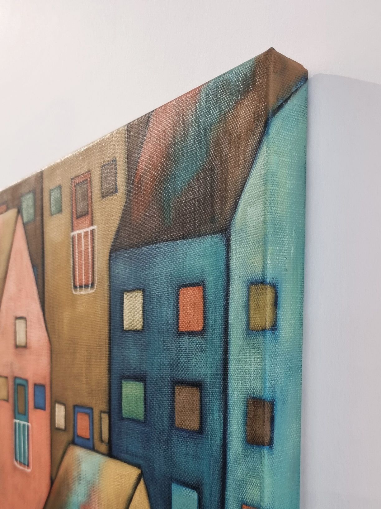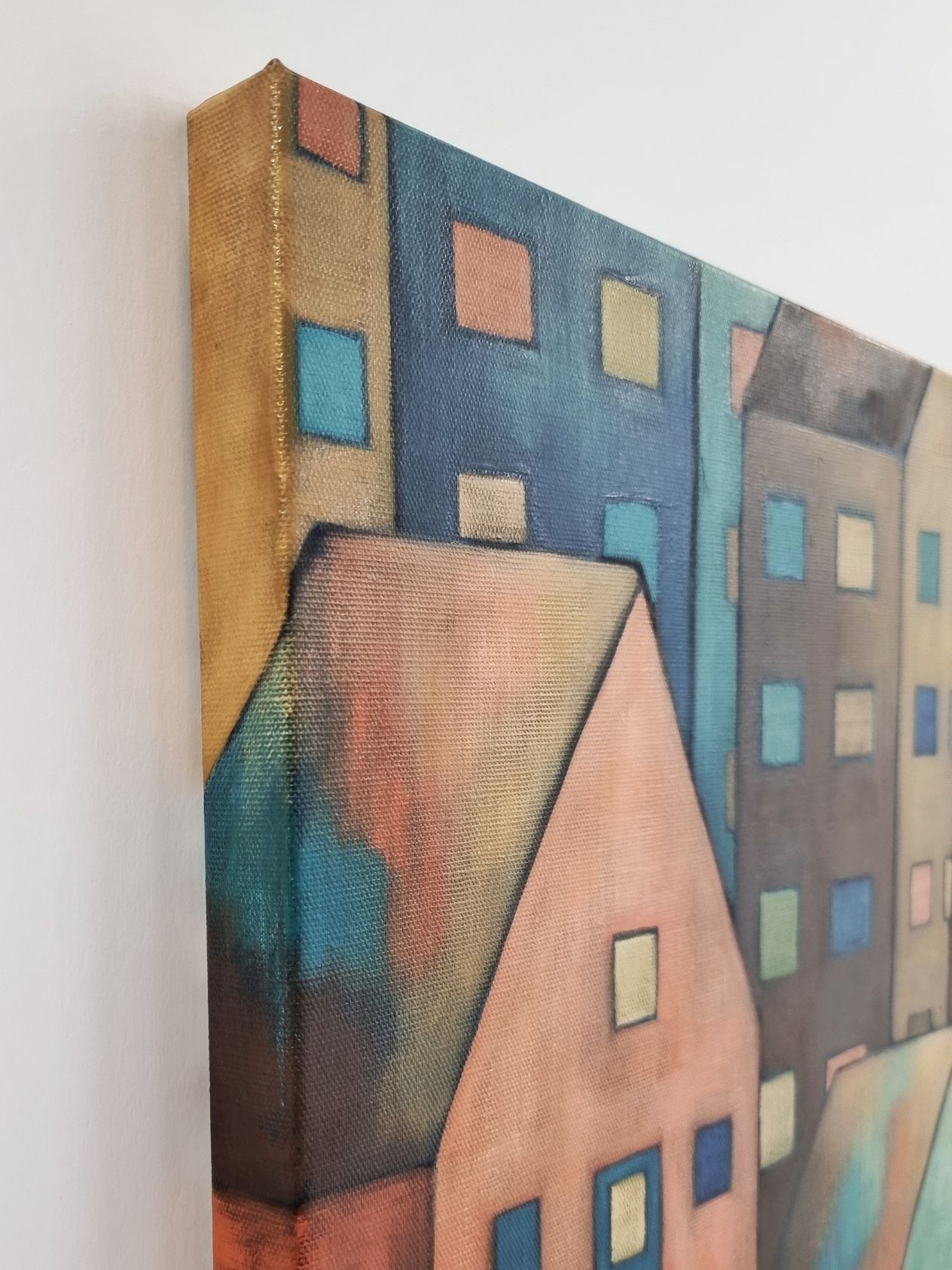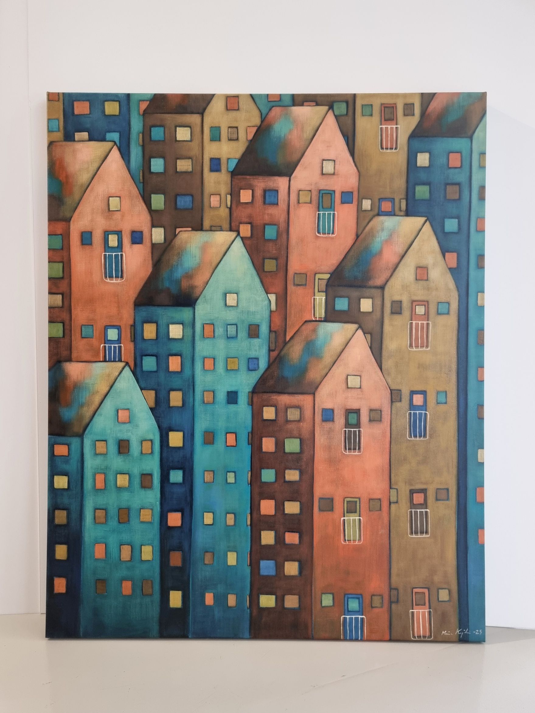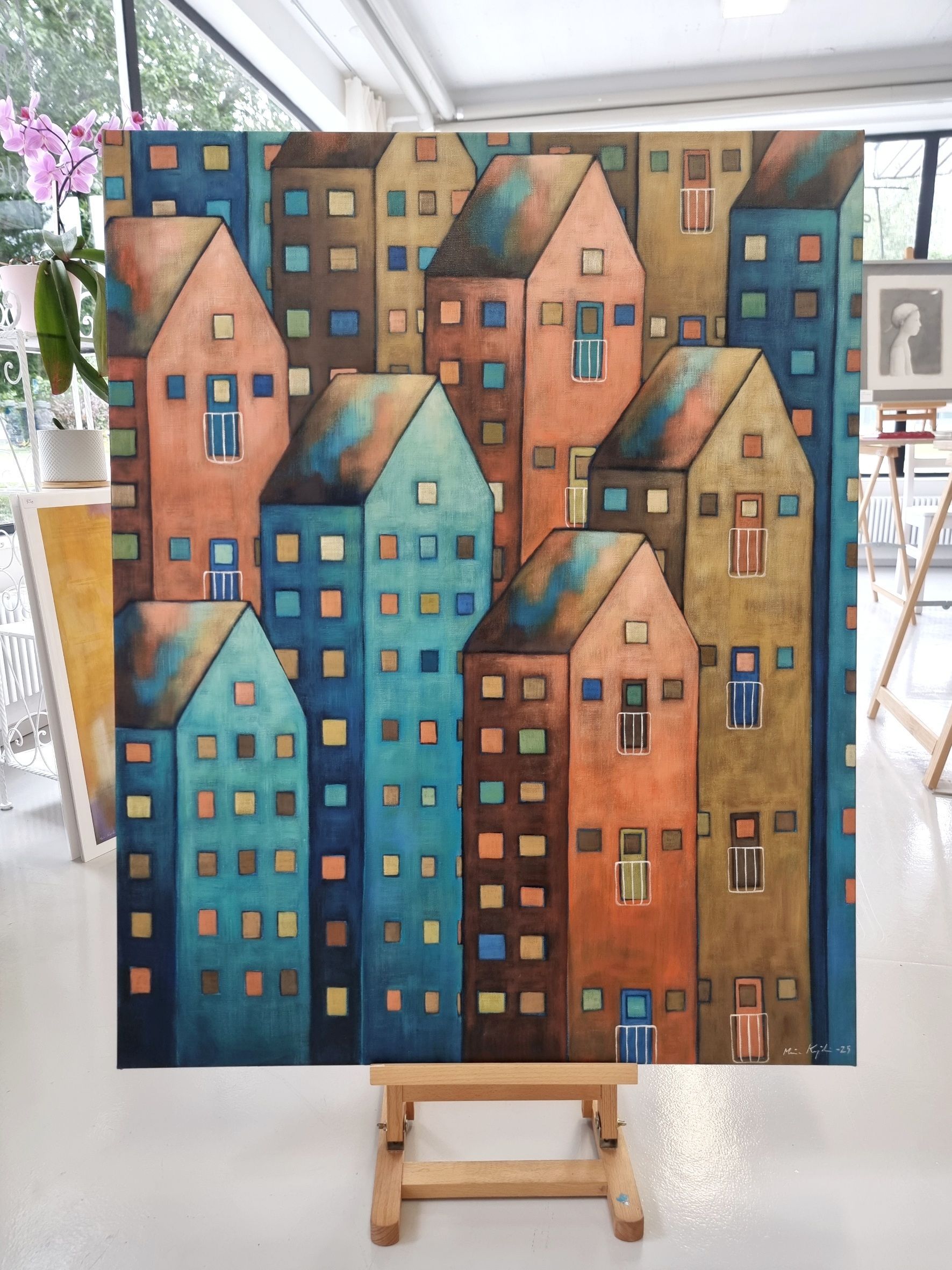 Olen maalannut teoksen laadukkaalle pellavalle ja pingottanut sen suomalaisesta männystä valmistettuihin 3 cm syviin kiilapuihin. Maalaus jatkuu reunoille asti, jolloin kehystystä ei välttämättä tarvita. Takana on ripustinlanka.