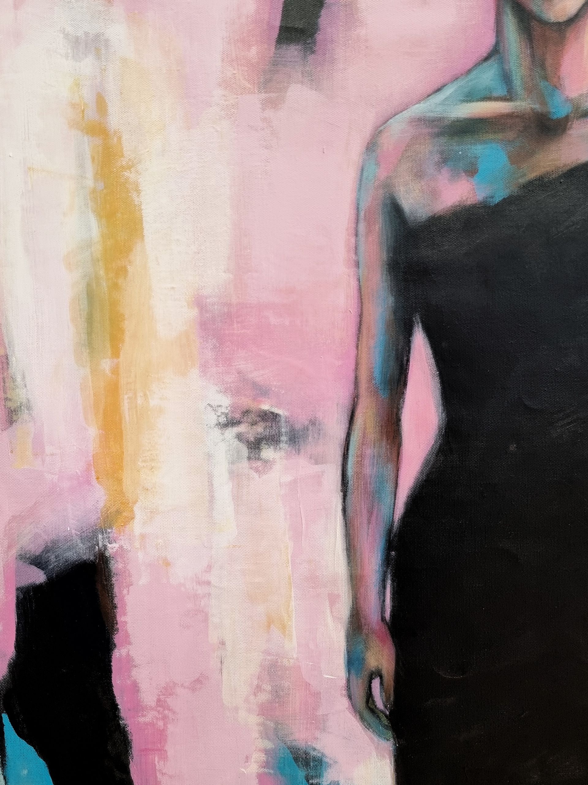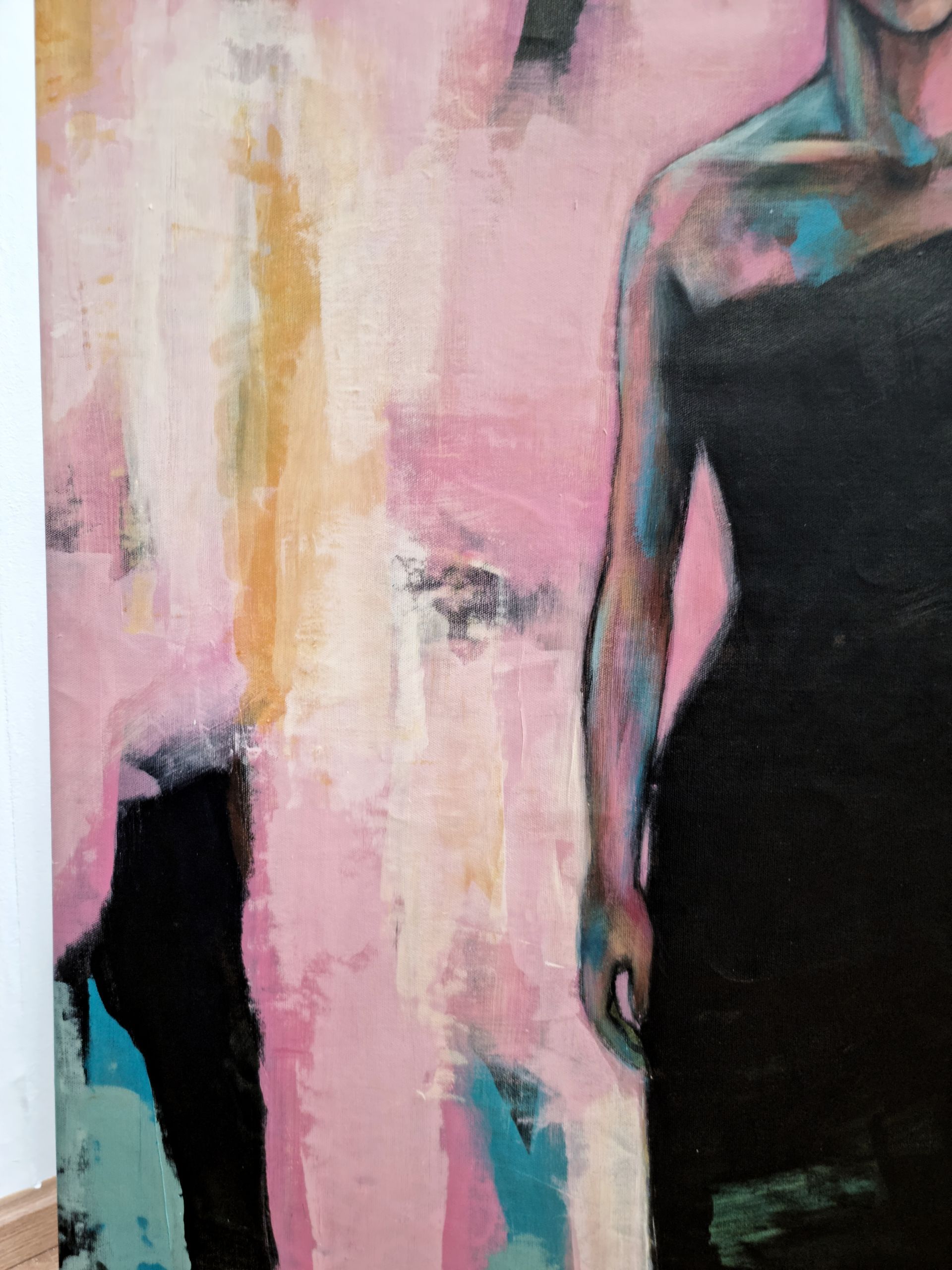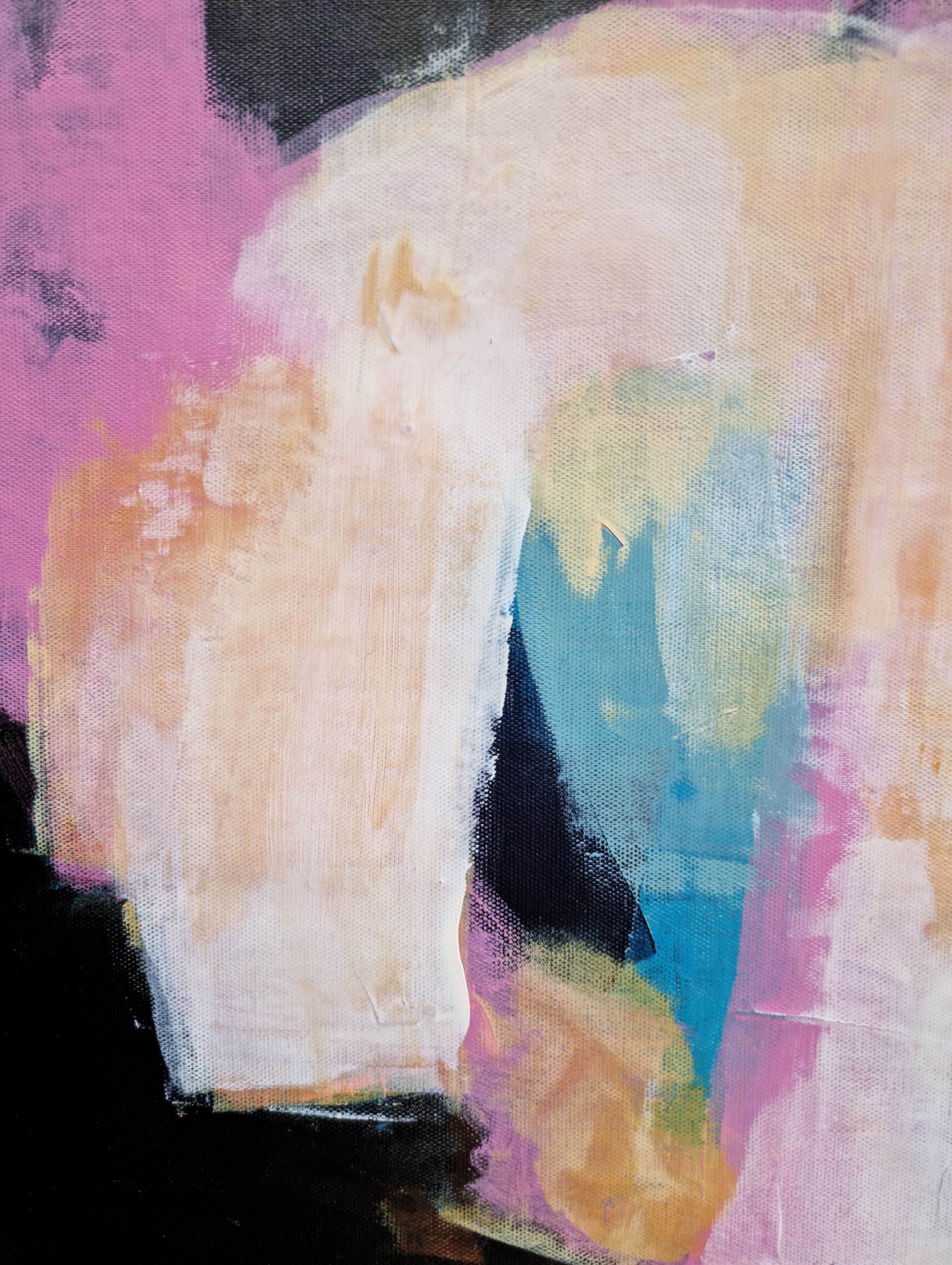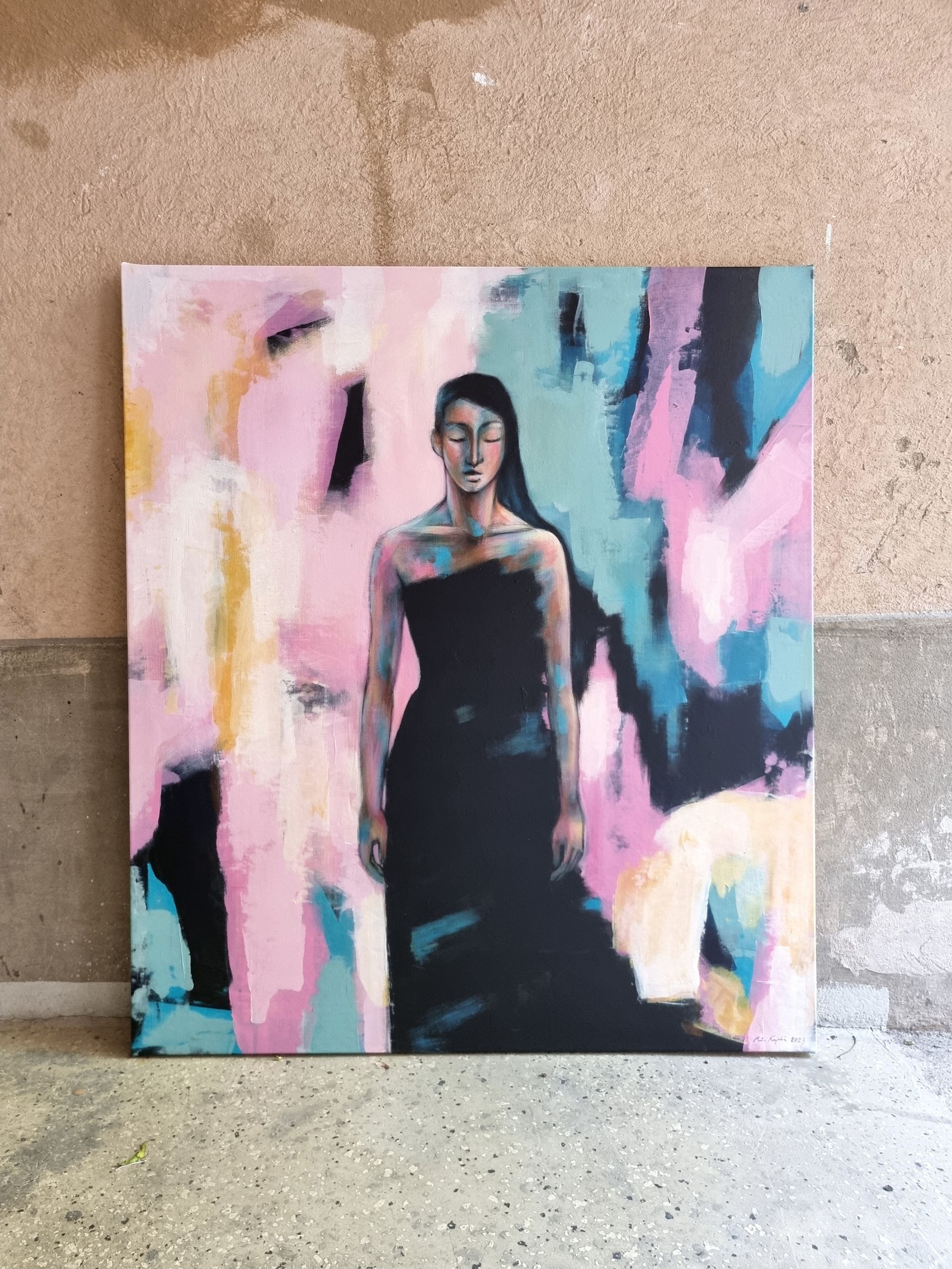 Hehkuva ja värikäs maalaus, jossa on kuitenkin rauhallinen tunnelma. Olen käyttänyt maalaamisessa siveltimien lisäksi erilaisia lastoja, mikä tekee maalauspinnasta mielenkiintoisen. Kangas on pingotettu 2 cm syviin suomalaisiin kiilapuihin, takana on ripustinlanka. Maalaus jatkuu reunoille asti, joten kehystystä ei välttämättä tarvita.