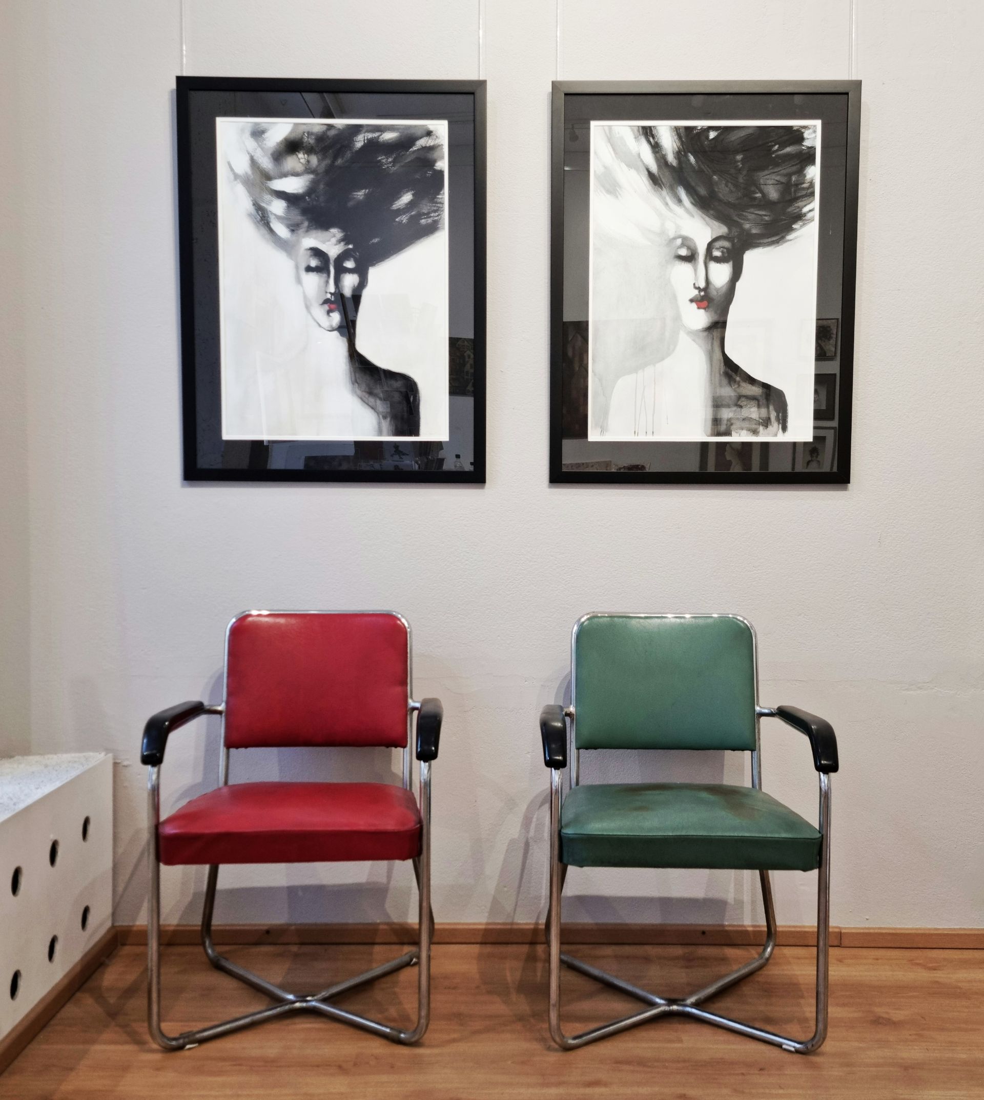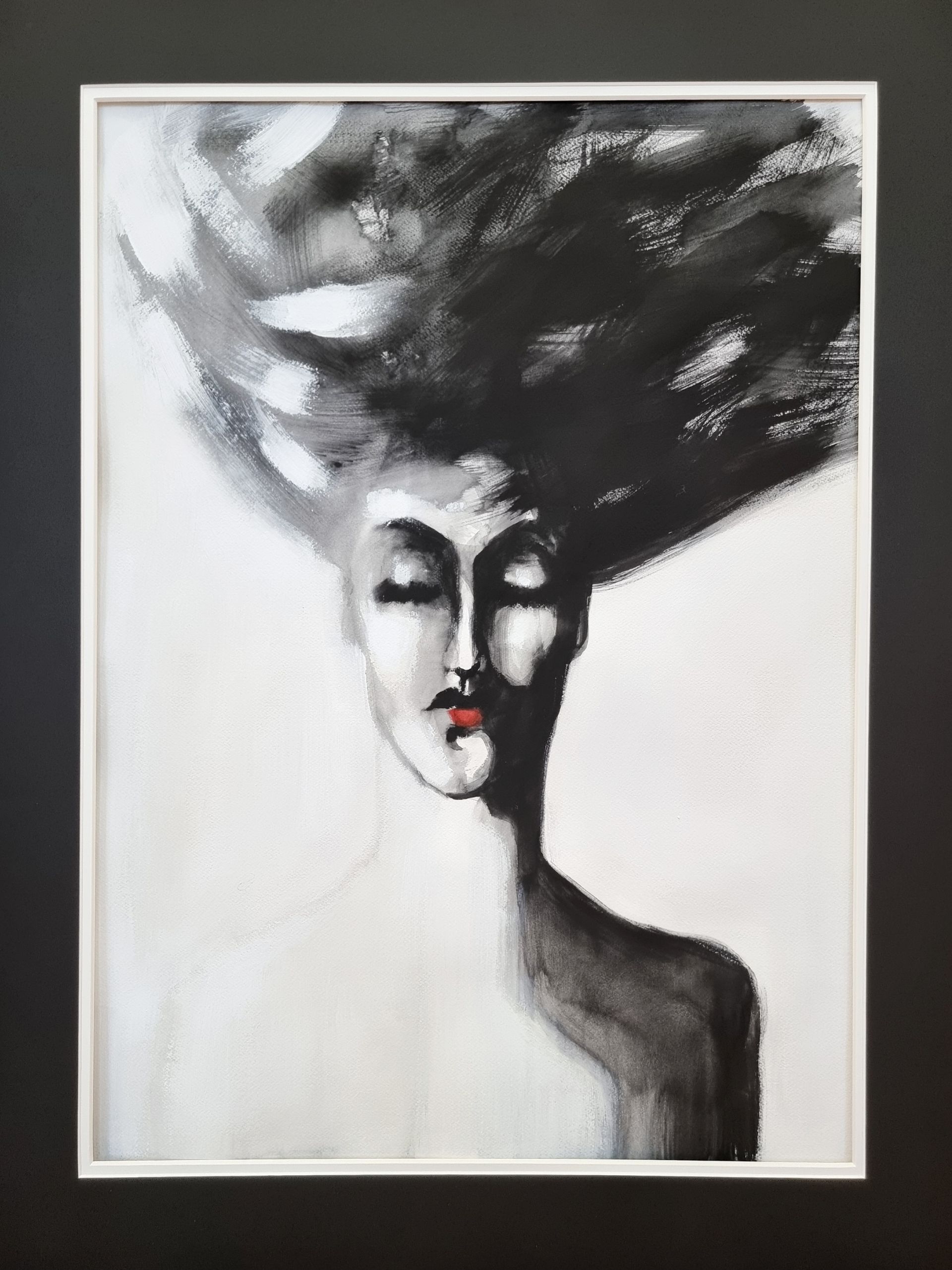 Olen maalannut teoksen nestemäisellä hiilellä ja akryyliväreillä tukevalle akvarellipaperille.