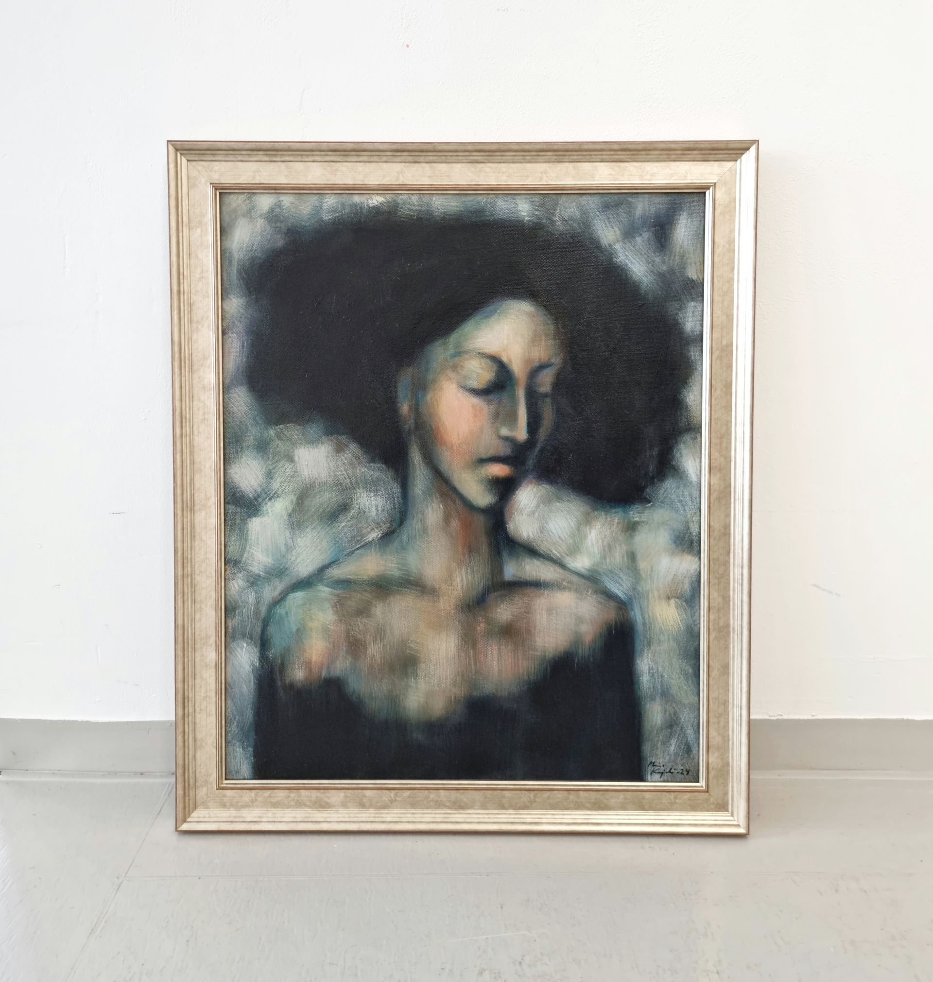 Olen maalannut teoksen öljyväreillä pellavakankaalle ja kehystänyt sen kaunilla rusehtavan hohtavalla kehyksellä. Koko kehyksineen on noin 63x53 cm.