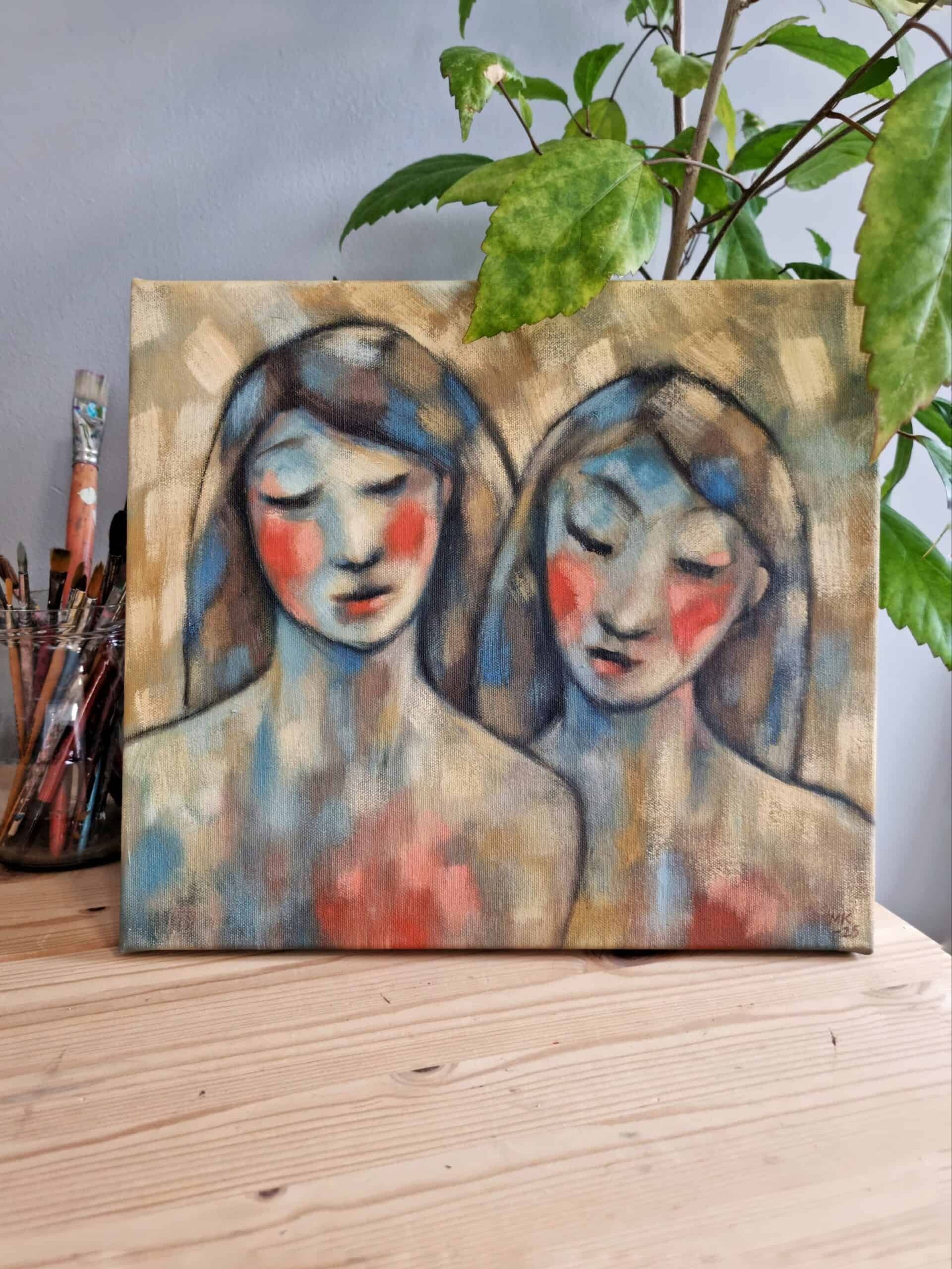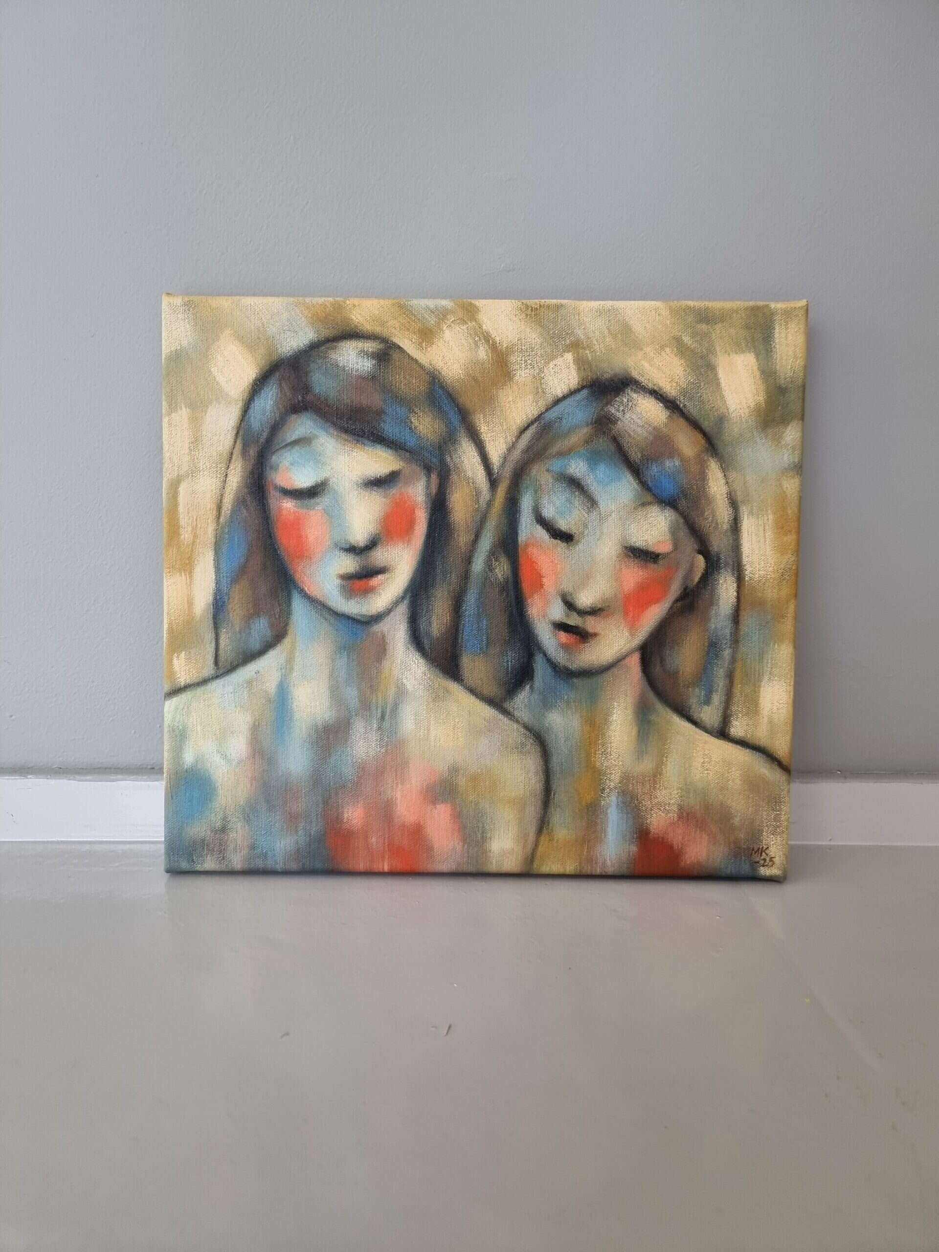 Pieni, keltaokran valaisema maalaus kahdesta erottamattomasta.